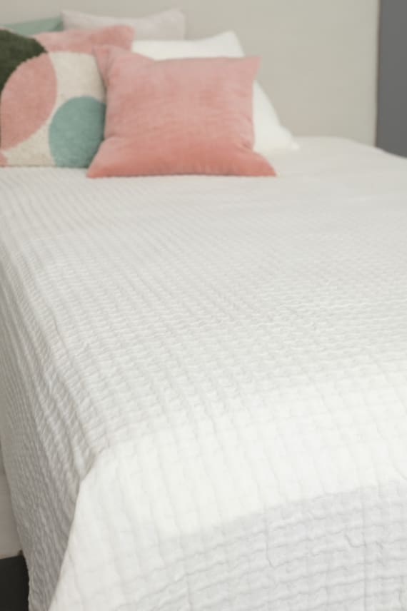 Kevyt tuplaleveä peitekangas kruunaa sängyn. Pehmeää puuvillapolyesteria, jossa kudonnalla on saatu aikaan vohvelimainen ulkonäkö.