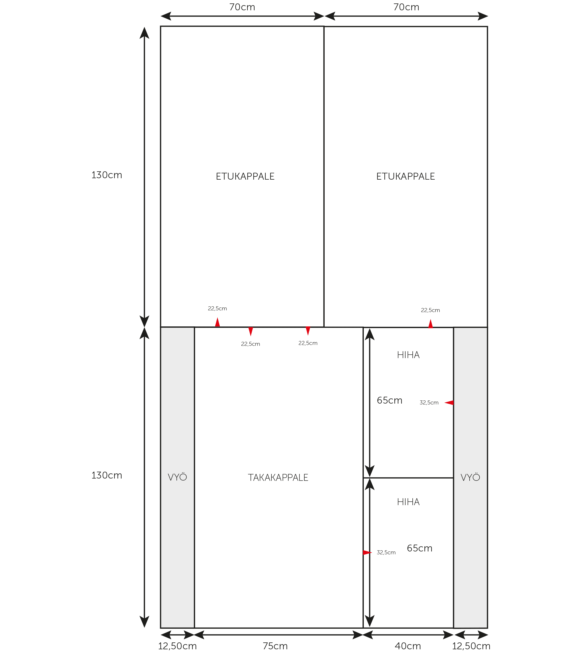 ja etu- ja takakappaleiden ylä- ja alareunat 2 cm päärmeenvaroilla.