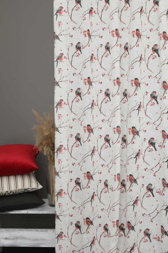 Ihanat punatulkut on painettu kauniisti läpikuultavalle verholaadulle. Kankaasta valmistetut verhot siivilöivät valoa kauniisti ja päästävät luonnon valon tilaan.