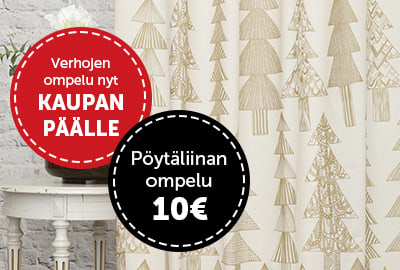 Verhokankaan ostajalle nyt suorien sivuverhojen ylä- ja alakäänteiden ompelu kaupan päälle 14.12.2025 asti. Sivujen ompelu alk. 9,45 €. Aloita valitsemalla kangas! Tarkemmat ehdot.